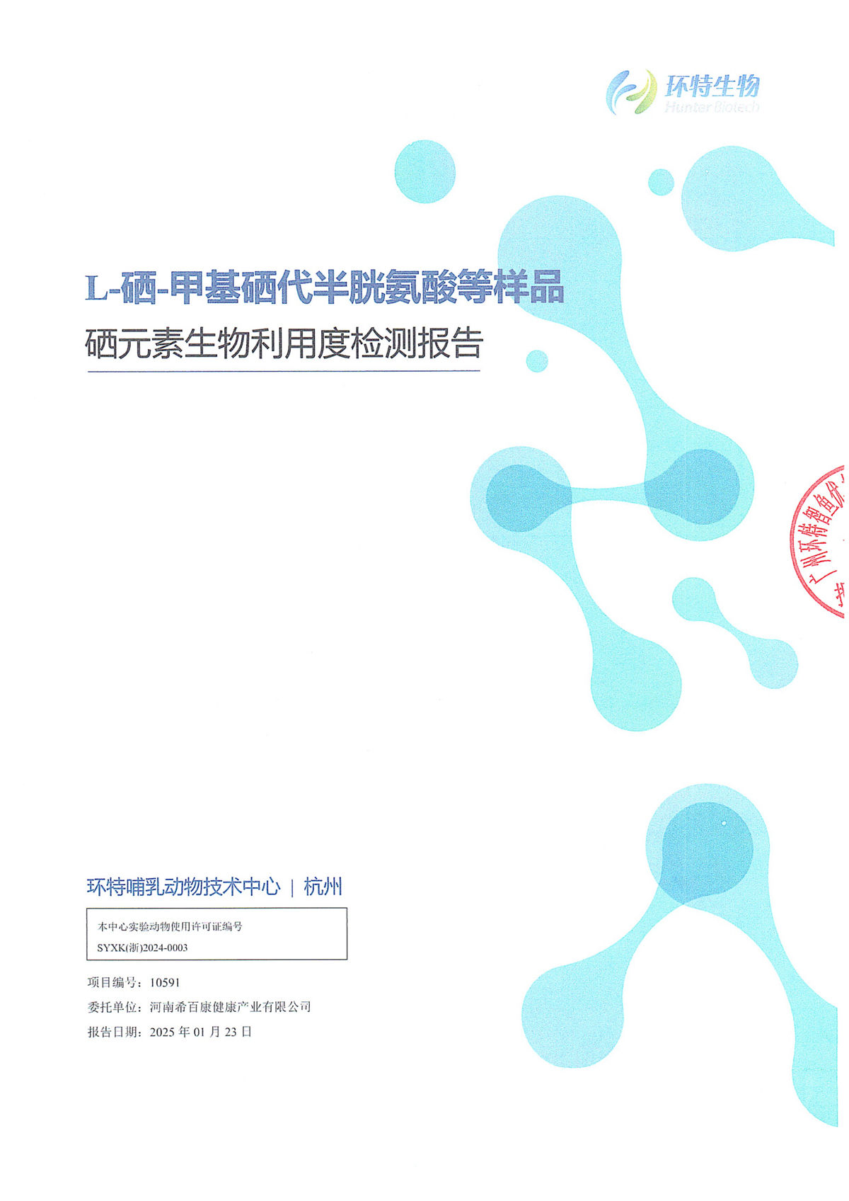 近日,国内权威检测机构——杭州环特生物科技股份有限公司(简称“环特生物”)发布检测报告,对河南希百康健康产业有限公司研发的L-硒-甲基硒代半胱氨酸进行了系统性生物利用度评估。报告显示,该产品在硒元素吸收效率与代谢维持时间上表现突出,为硒营养补充领域提供了科学依据。